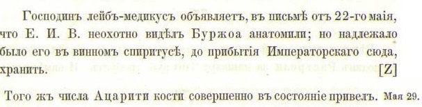 В более поздней записи Шумахера от 28 мая 1724 года говорится: «Мая 28. Господин лейб-медикус объявляет, в письме от 22 мая, что Е.И.В. неохотно видел Буржоа анатомили; но надлежало было его в винном спиритиусе, до прибытия Императора сюда, хранить» (ил. 46).