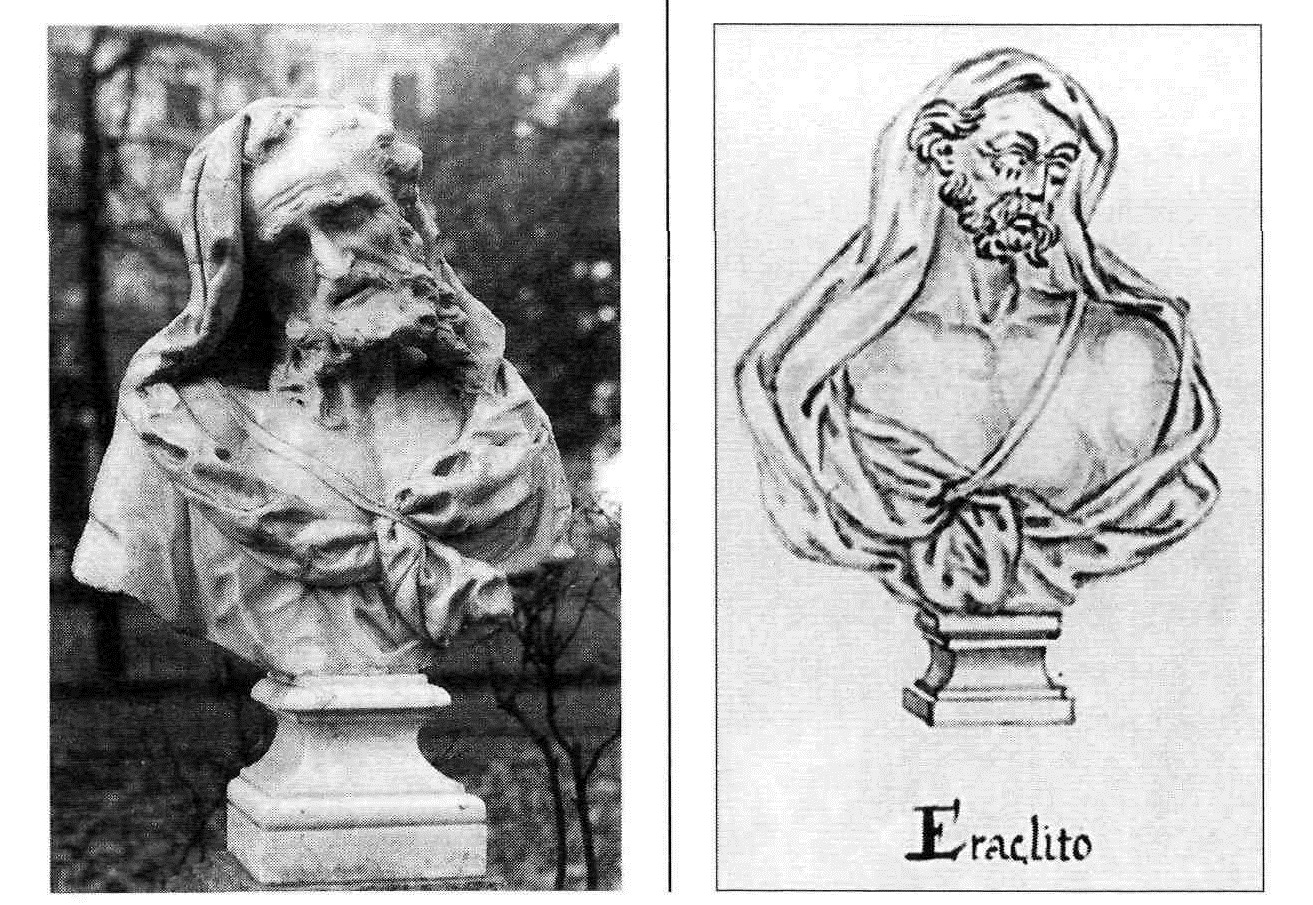 бюсты Диогена и Гераклита и их рисунки из Петровского альбома. Если мрамор и рисунок Диогена соответствуют друг другу, то такие же изображения Гераклита «инверсны по вертикали» друг другу.