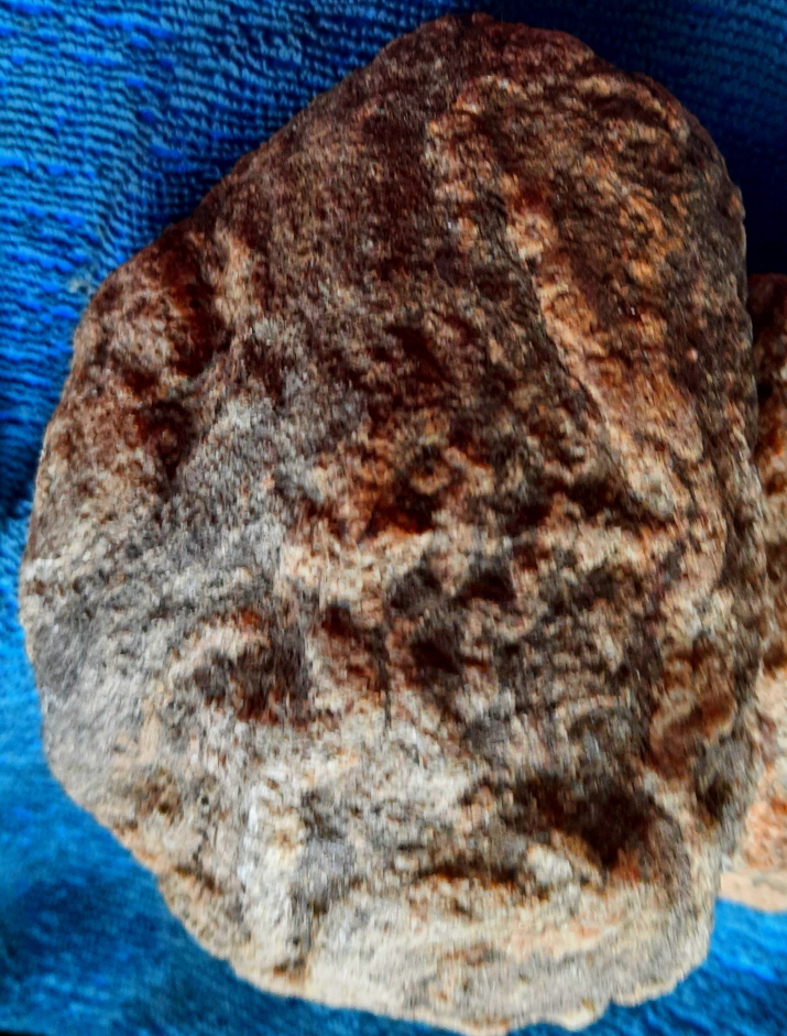 По всей видимости, безымянный древний ваятель долго и тщательно подбирал исходный материал. В итоге им оказался «желвак» обтекаемой формы особо твердой темно - коричневой кварцитовой породы с уже знакомой нам редчайшей спецификой. Сверху этот приплюснутый темный квази-эллипсоид был покрыт , как яйцо скорлупой, оболочкой совсем светлой породы с микро - кварцитовыми вкраплениями, сверкающими на солнце, как водяные брызги.